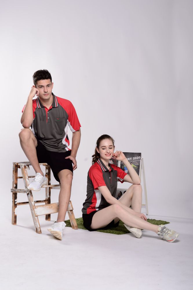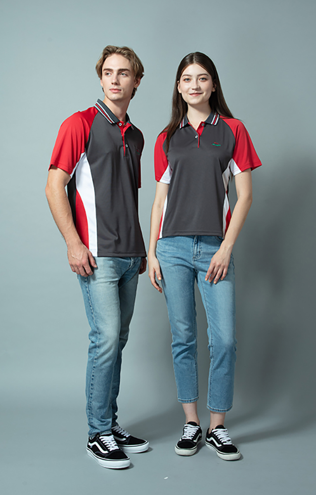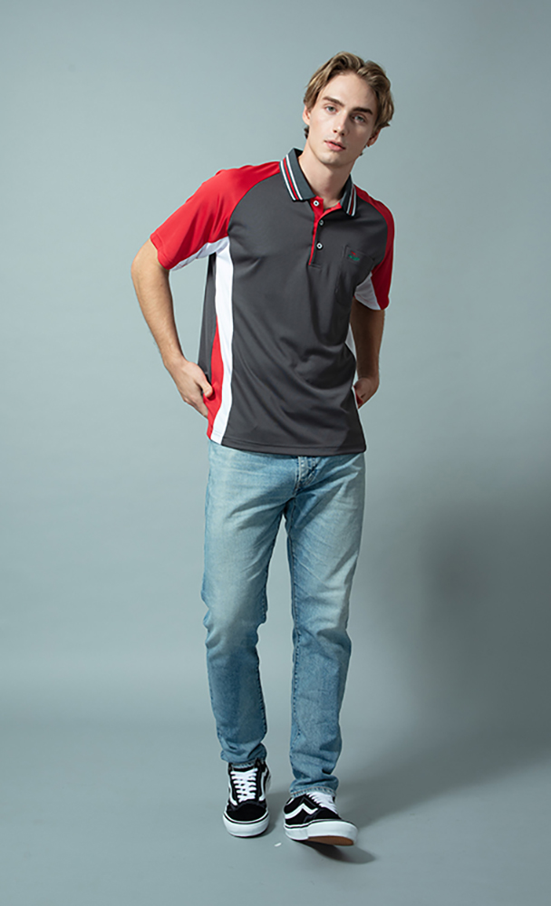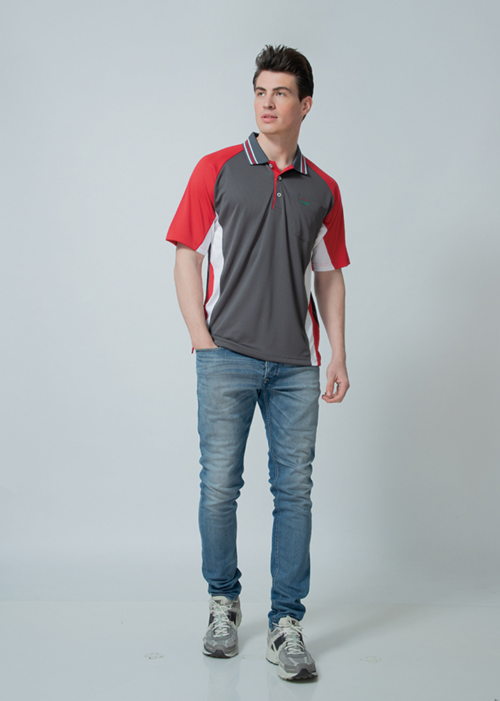 涼感排汗布:上層 49% 聚酯纖維涼感紗,清涼透氣;下層 51% 聚酯纖維排汗紗,吸濕排汗快乾,兼具舒適與乾爽穿著感。